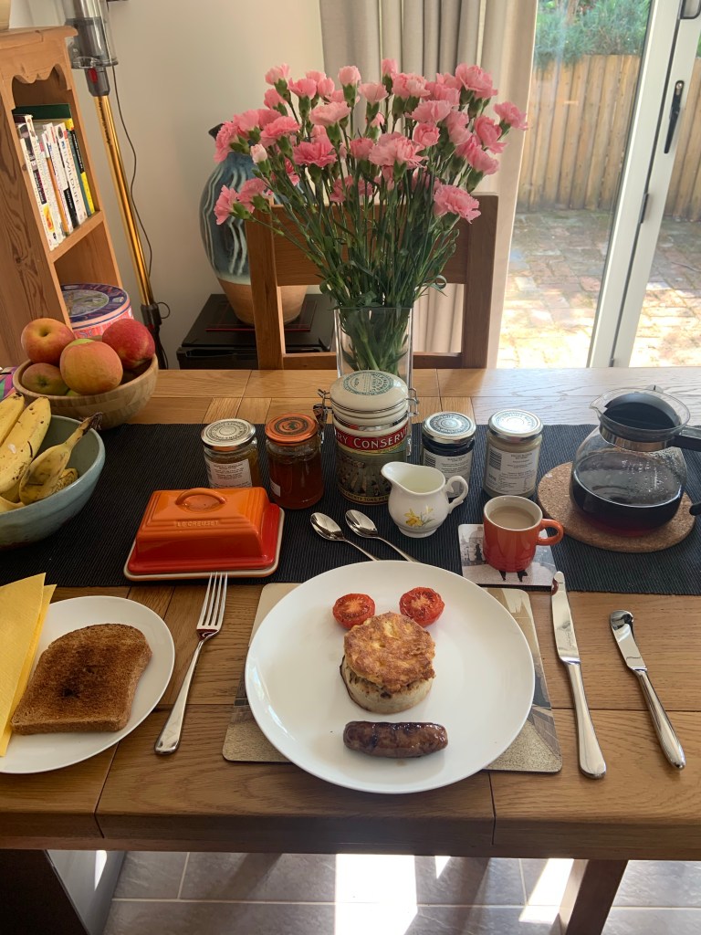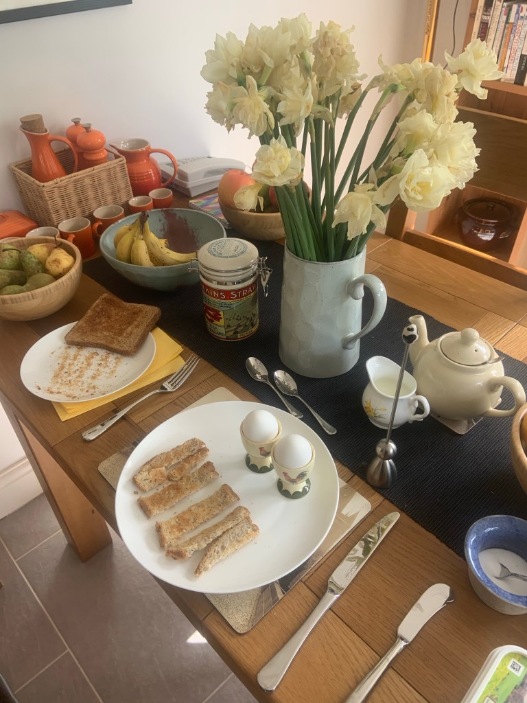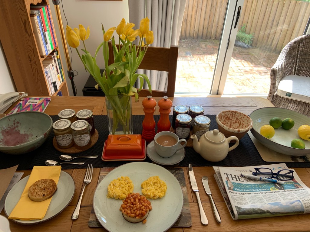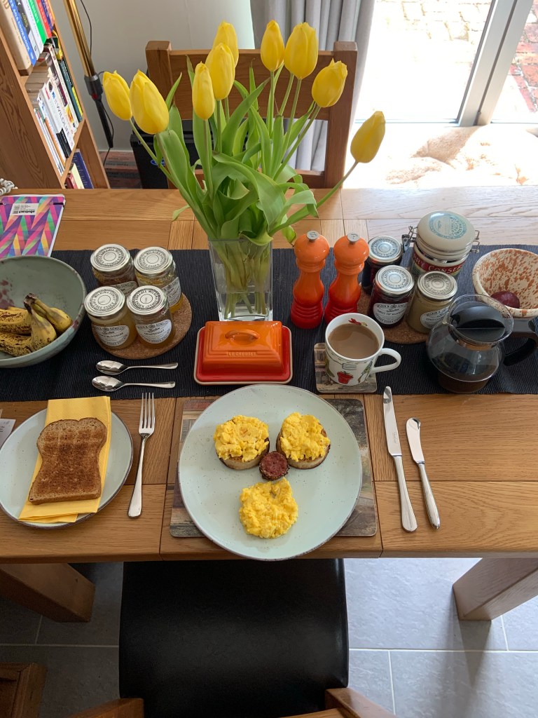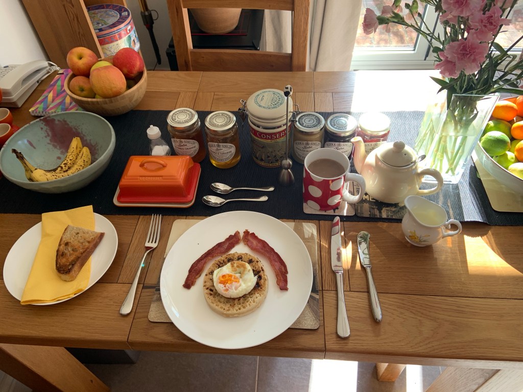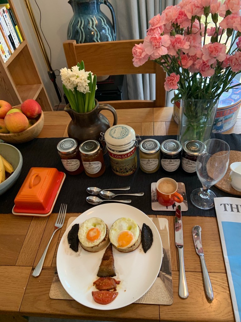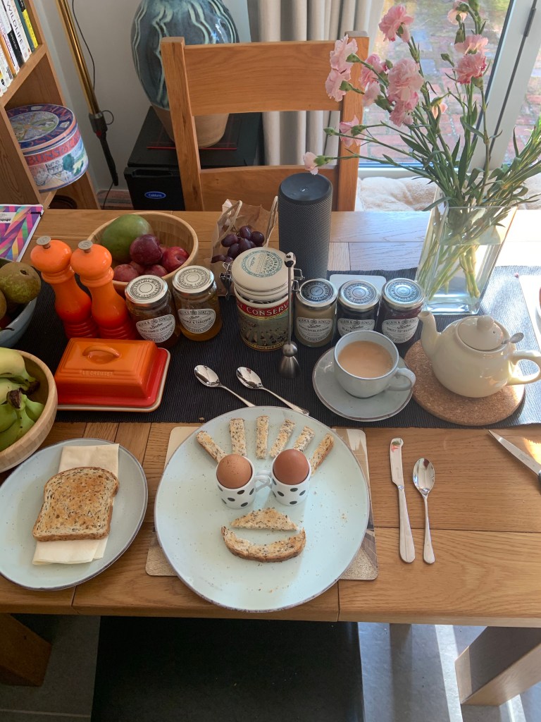 Posted on April 14, 2020June 7, 2020Confinement Breakfasts “Breakfast”, said the Saint, laconically, “Two boiled eggs, toast and a pint of coffee.” (Alias the Saint)