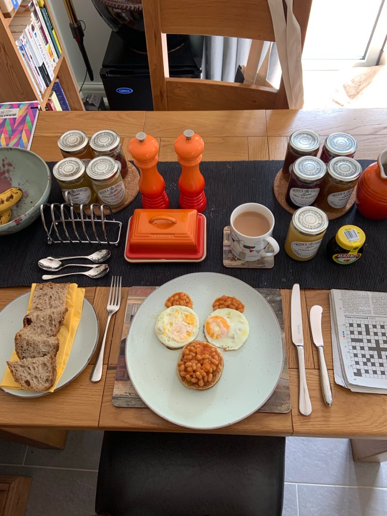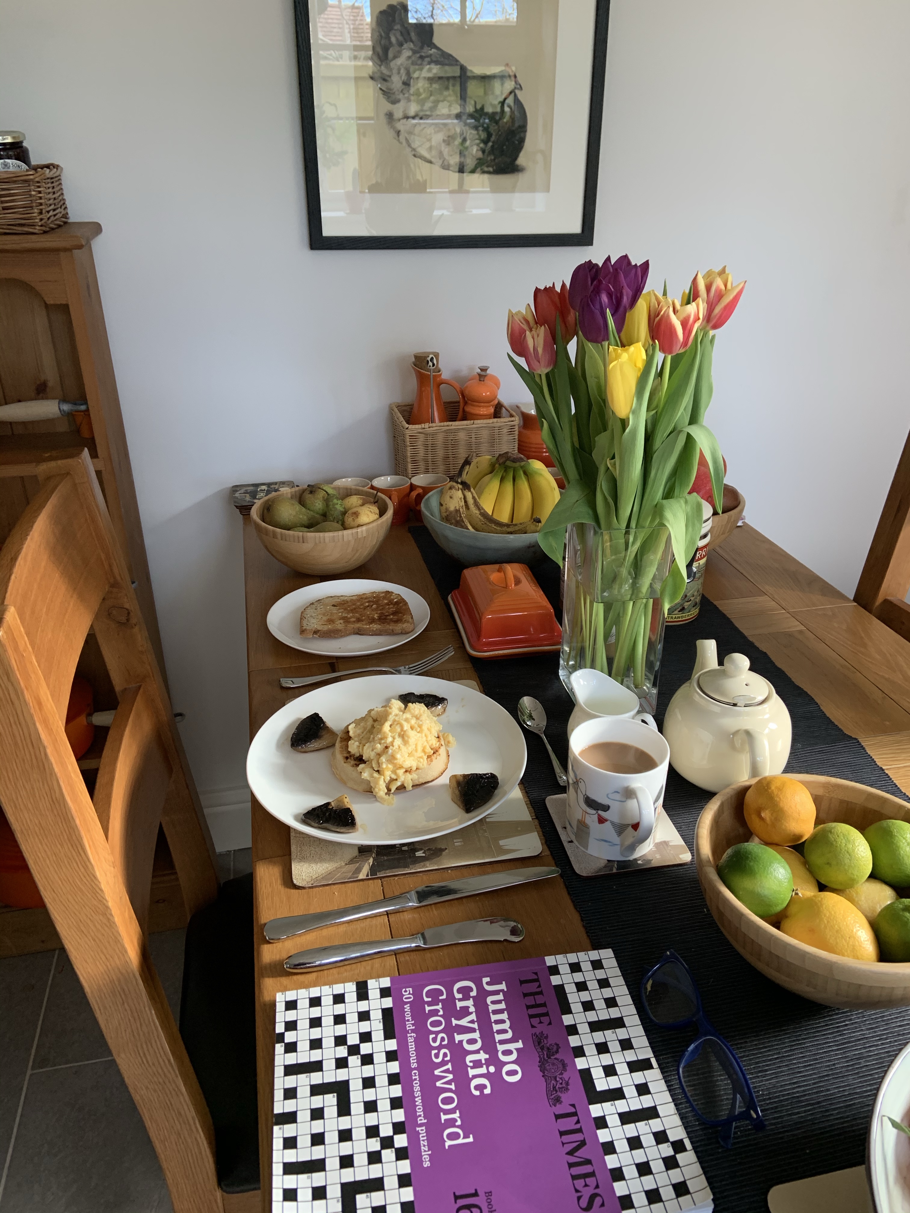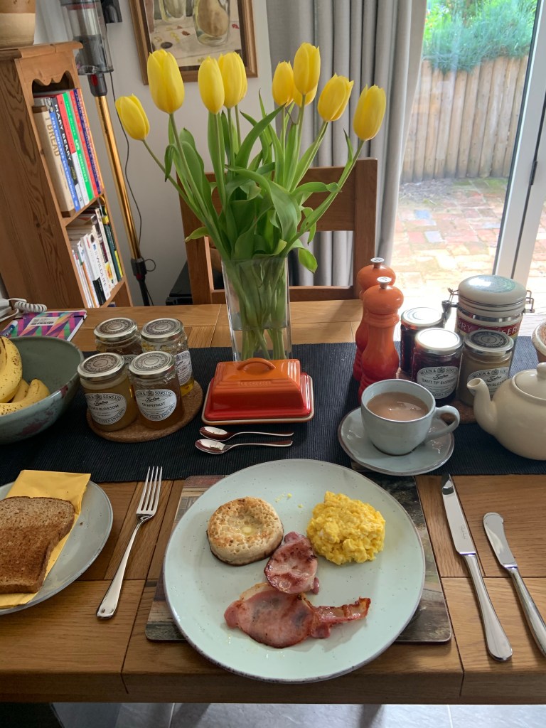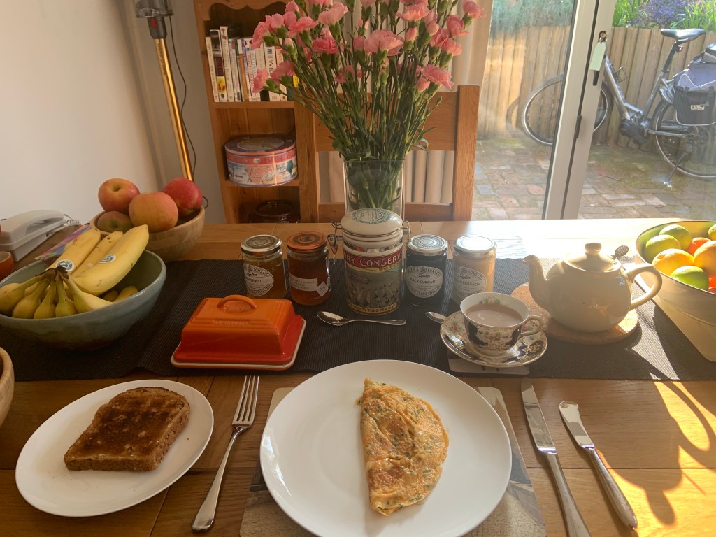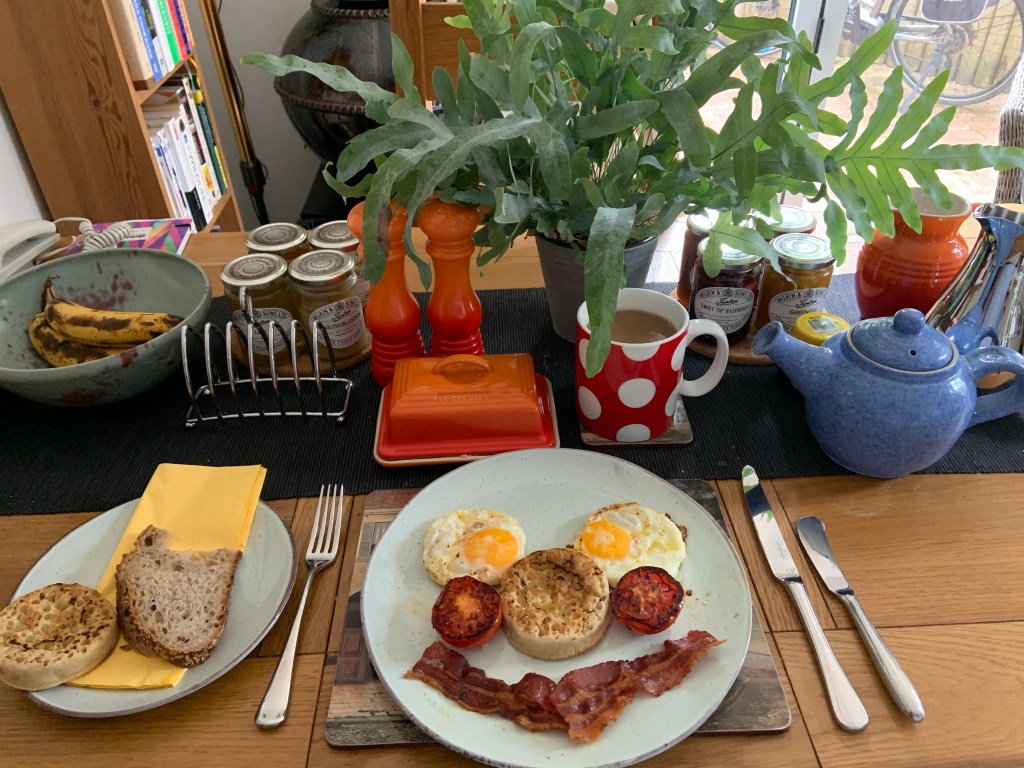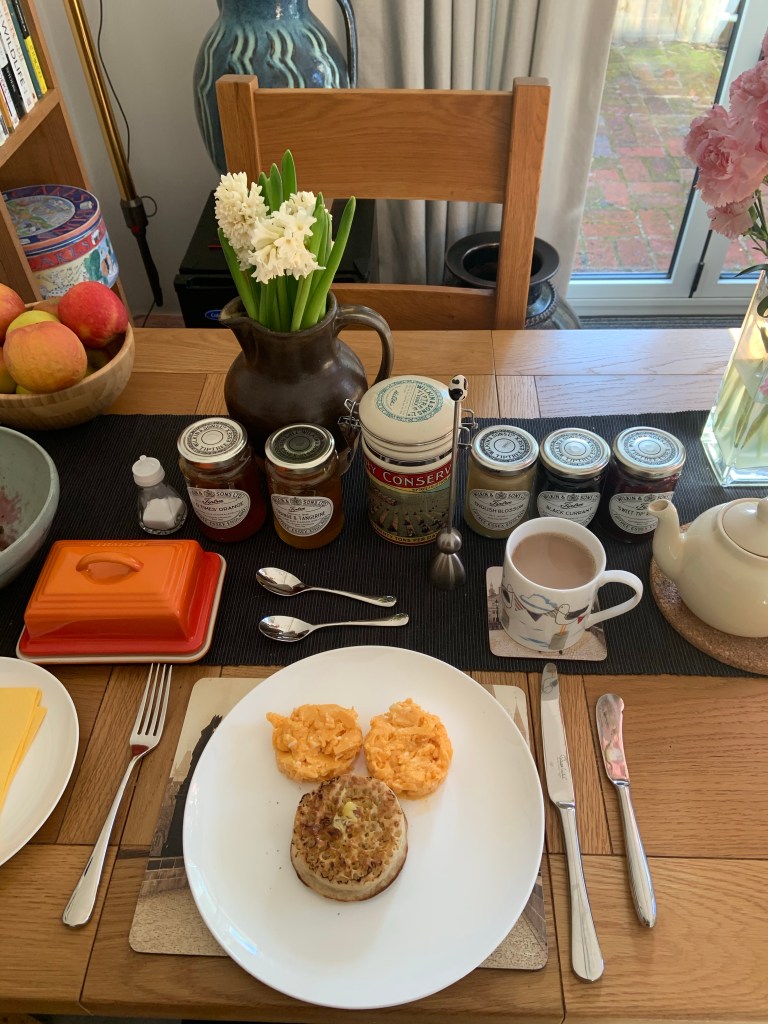 Posted on April 14, 2020June 7, 2020Confinement Breakfasts “Breakfast”, said the Saint, laconically, “Two boiled eggs, toast and a pint of coffee.” (Alias the Saint)