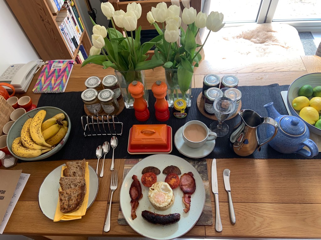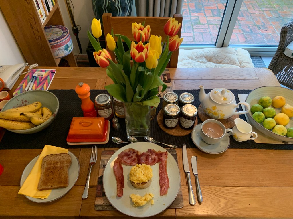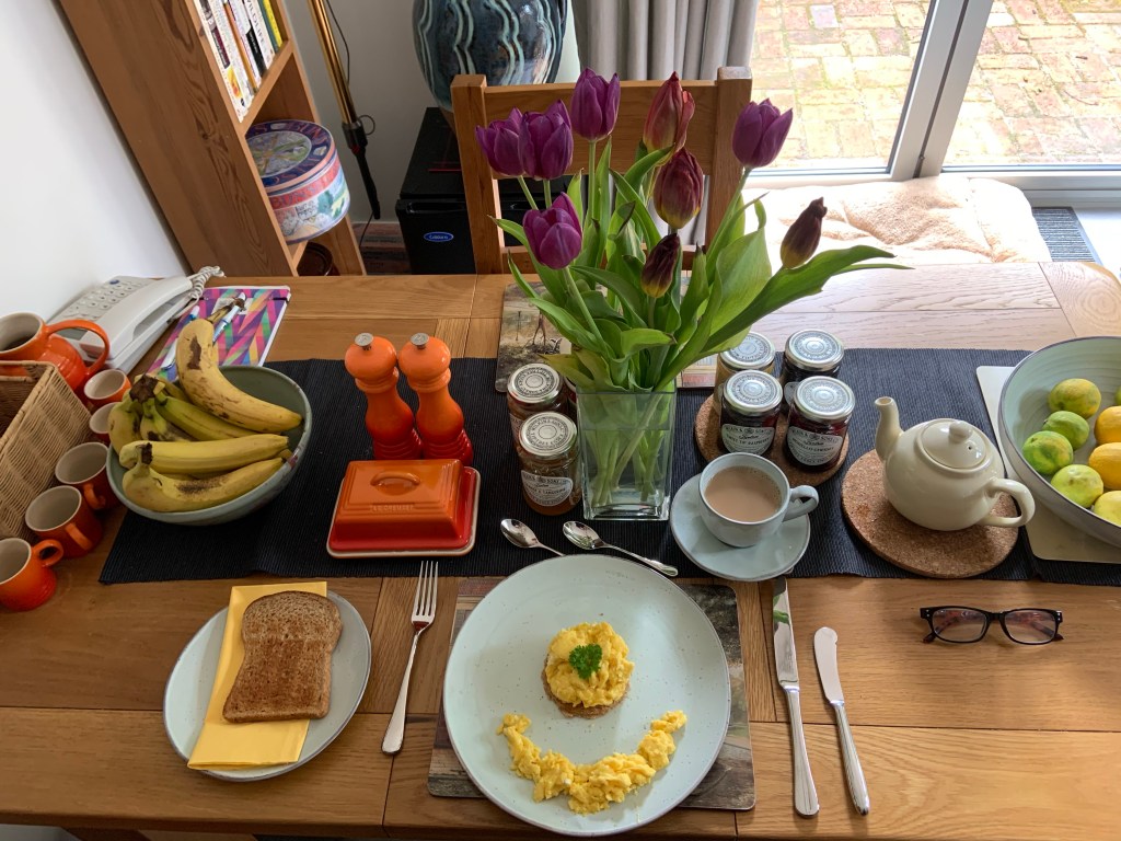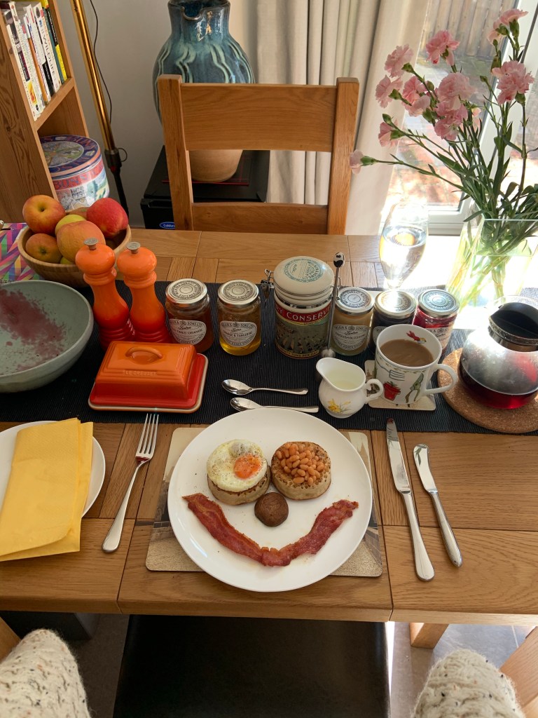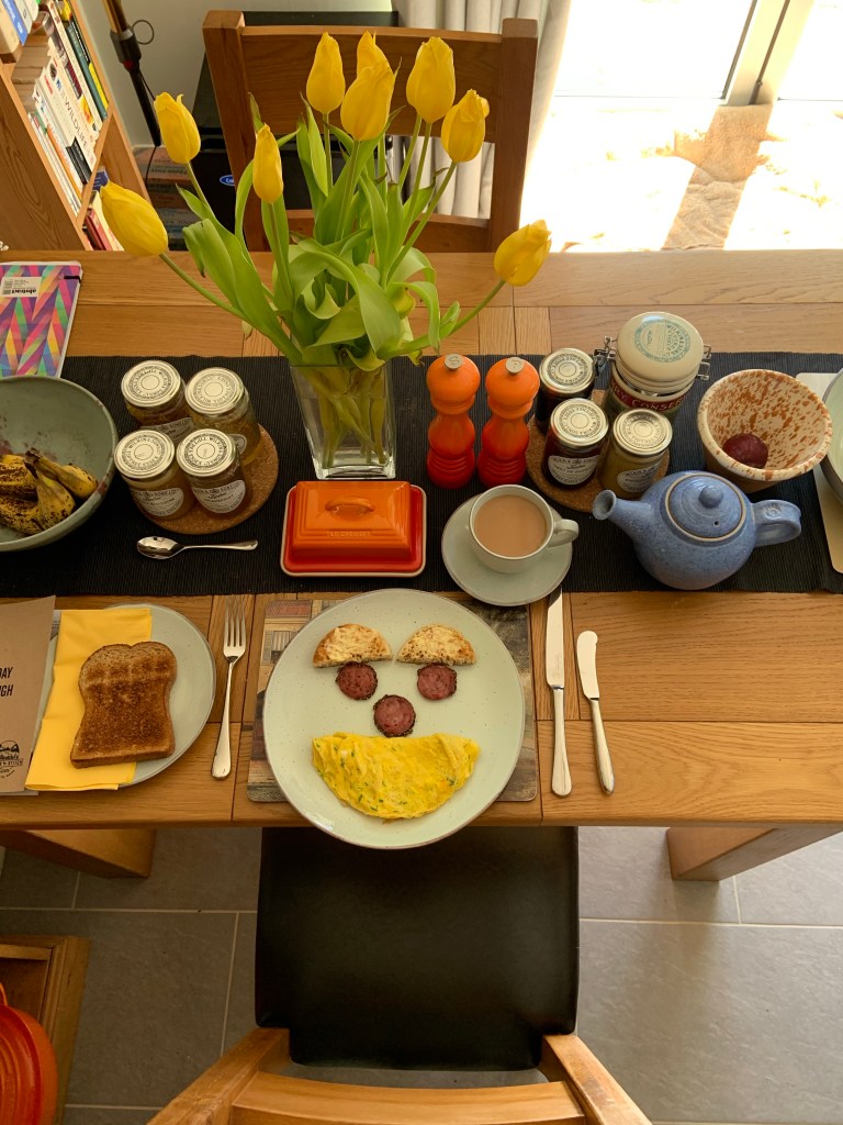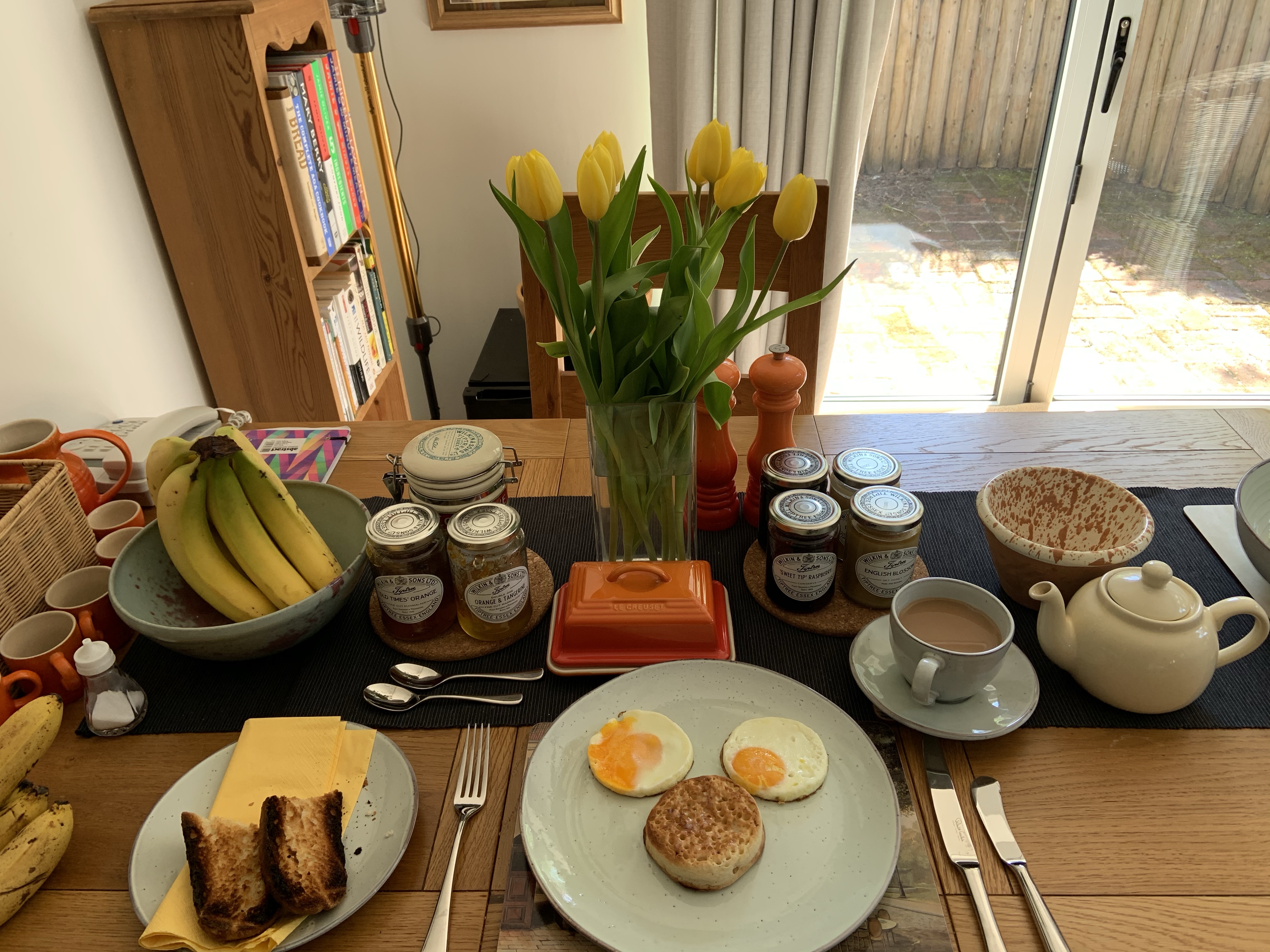 Posted on April 14, 2020June 7, 2020Confinement Breakfasts “Breakfast”, said the Saint, laconically, “Two boiled eggs, toast and a pint of coffee.” (Alias the Saint)