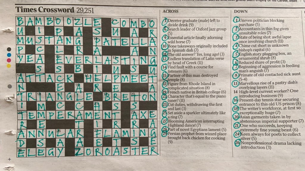 From quite which recess of the mind I recalled “helpmeet” eludes me, but I found it in the end. “Espalier” then fell into place. A pleasant puzzle. “Antitrade”…