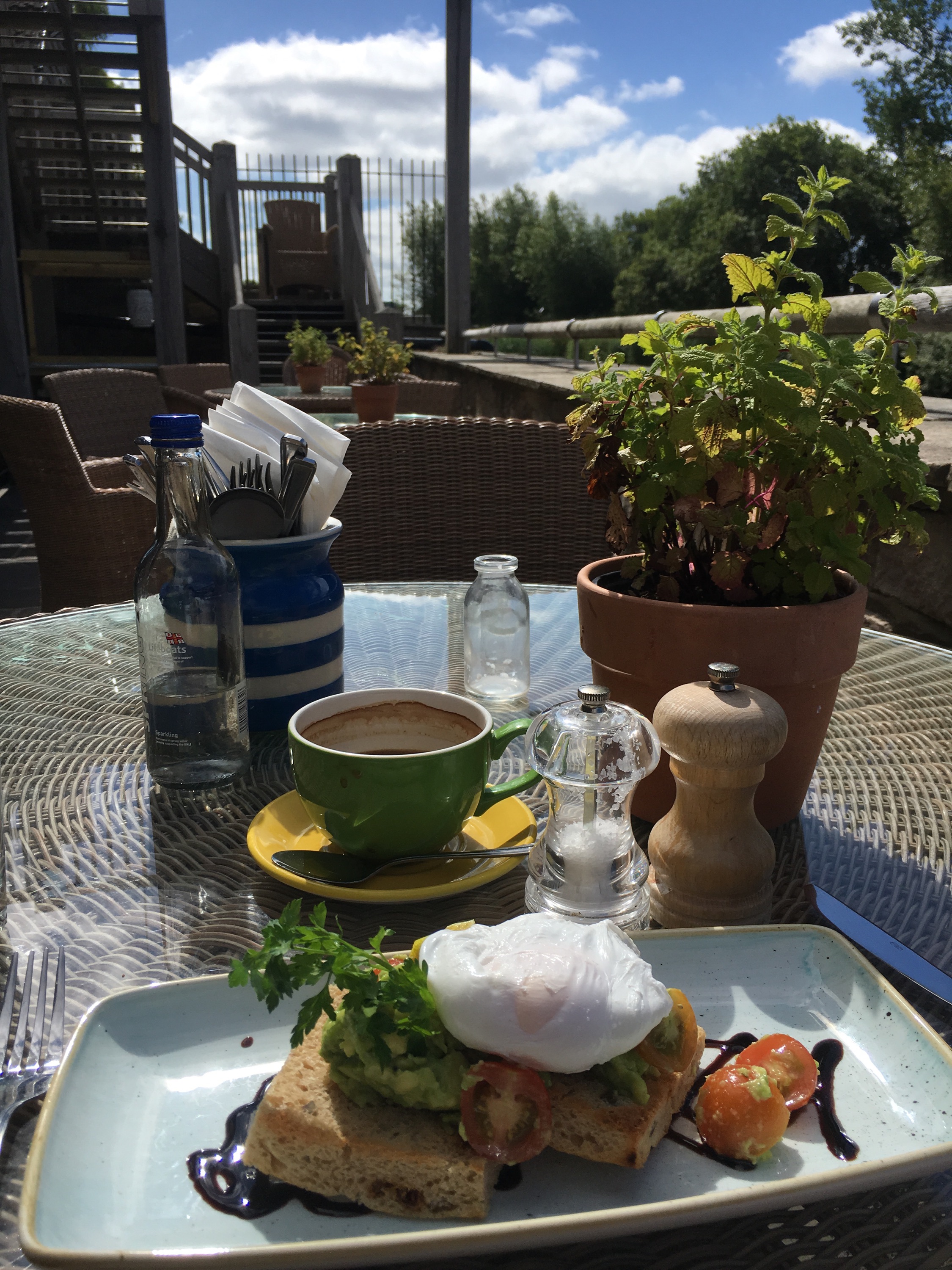 A hipster breakfast of crushed avocados on focaccia with cherry tomatoes, redeemed by a manly poached egg, at the Old Granary, Wareham, beside the River Frome.