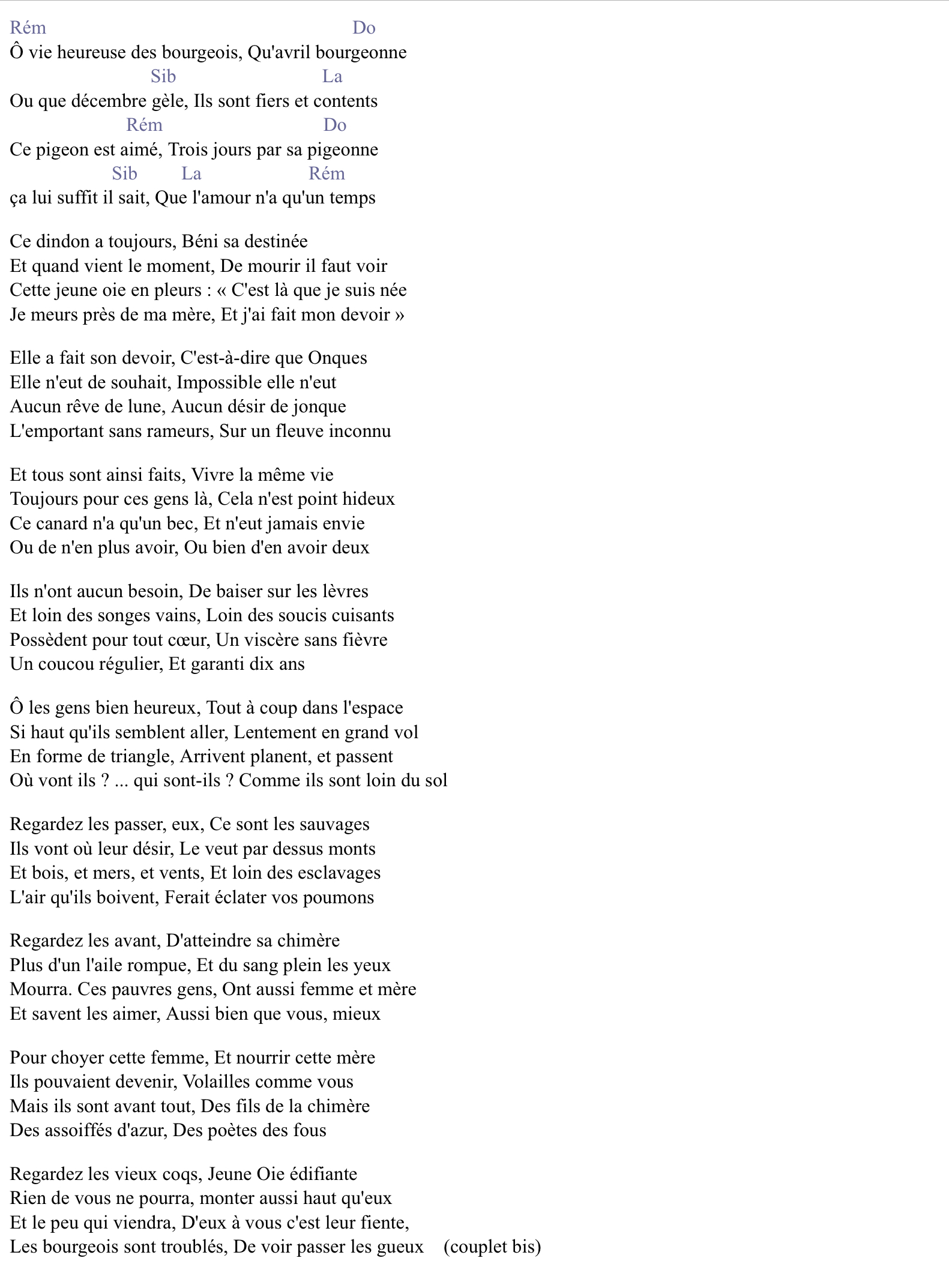 Il nous faut regarder ce qu’il y a de beau Le ciel gris ou bleuté, les filles au bord de l’eau L’ami qu’on sait fidèle, le soleil de demain Le vol d’une hirondelle, le bateau qui revient L’ami qu’on sait fidèle, le soleil de demain Le vol d’une hirondelle, le bateau qui revient