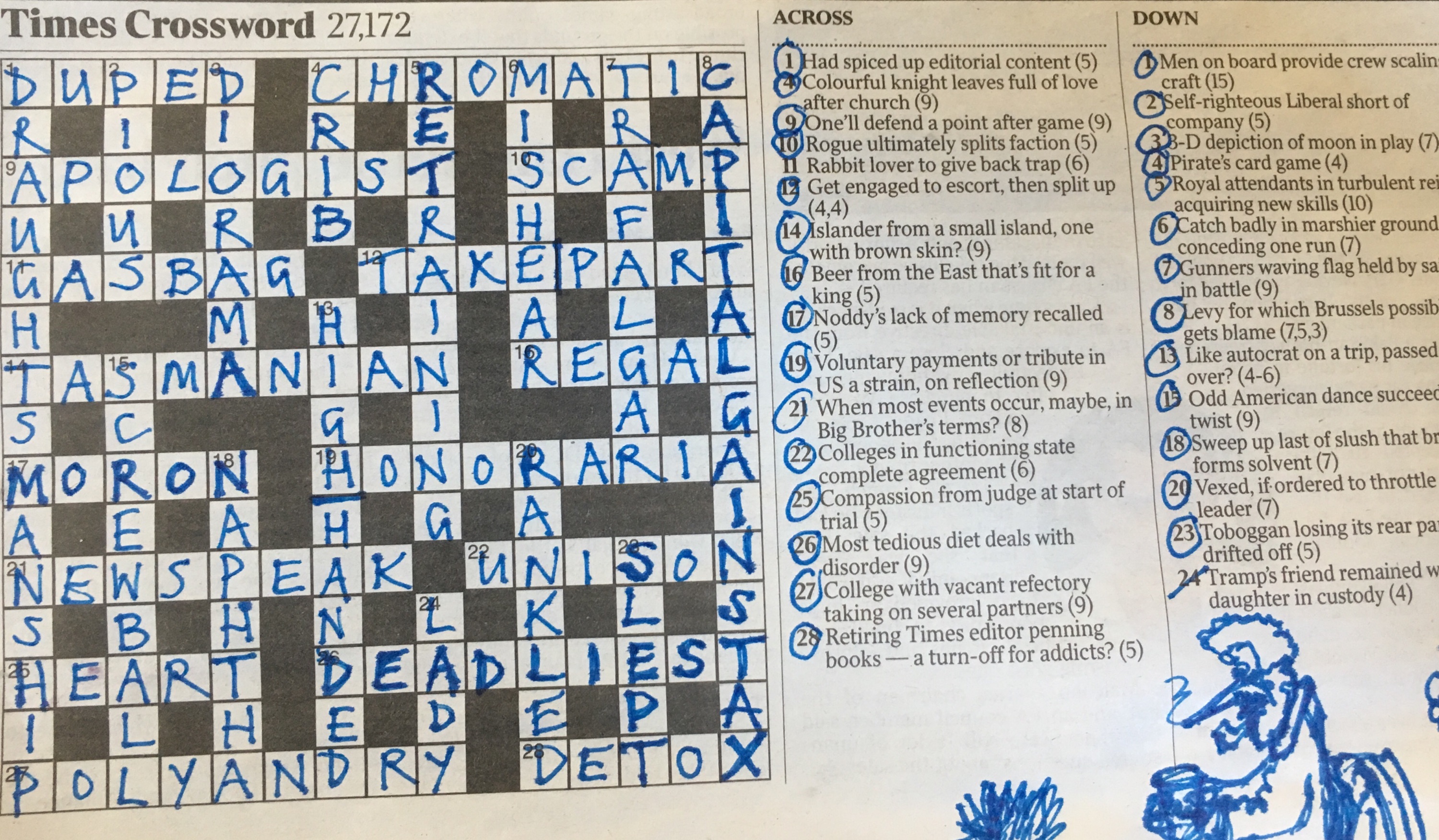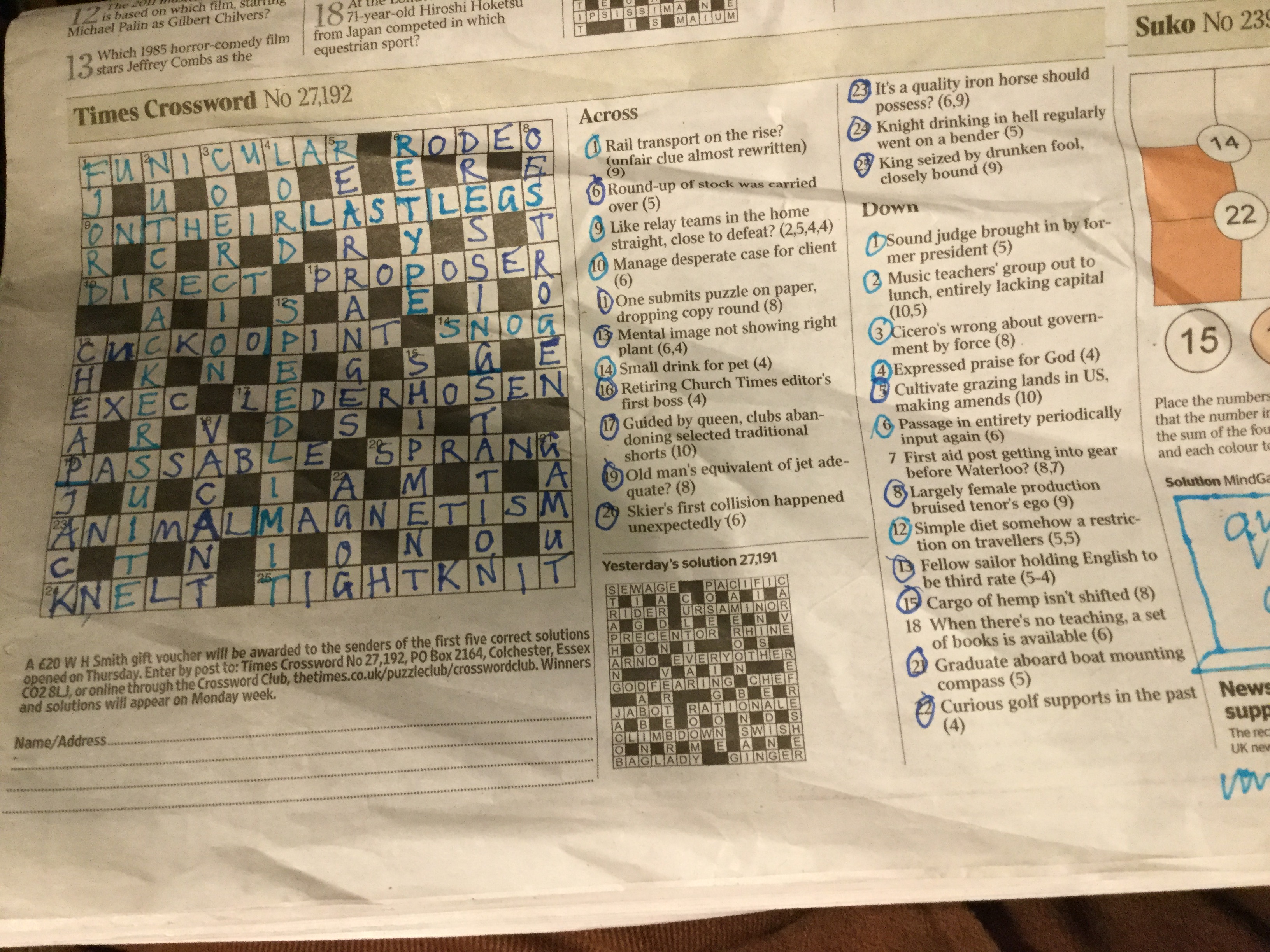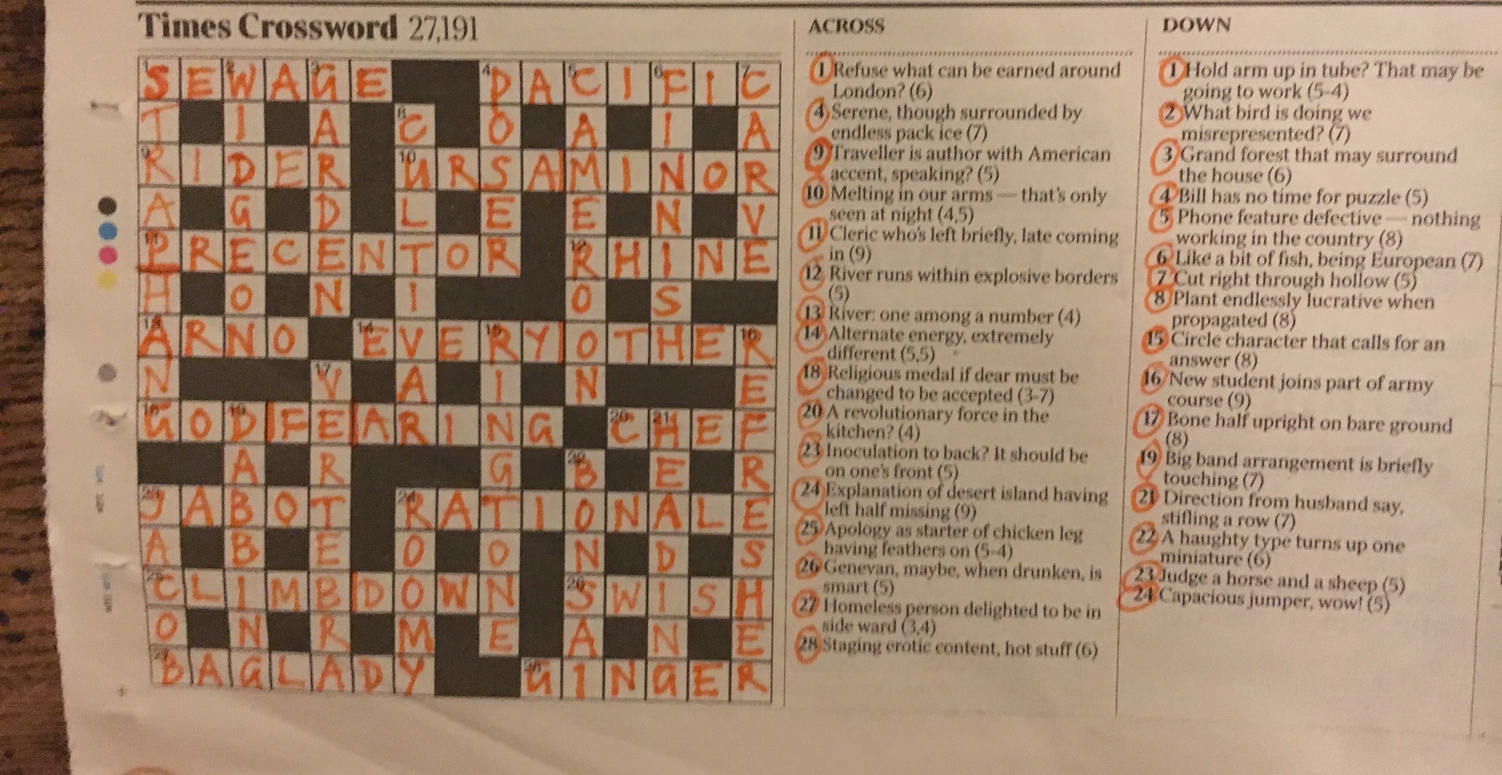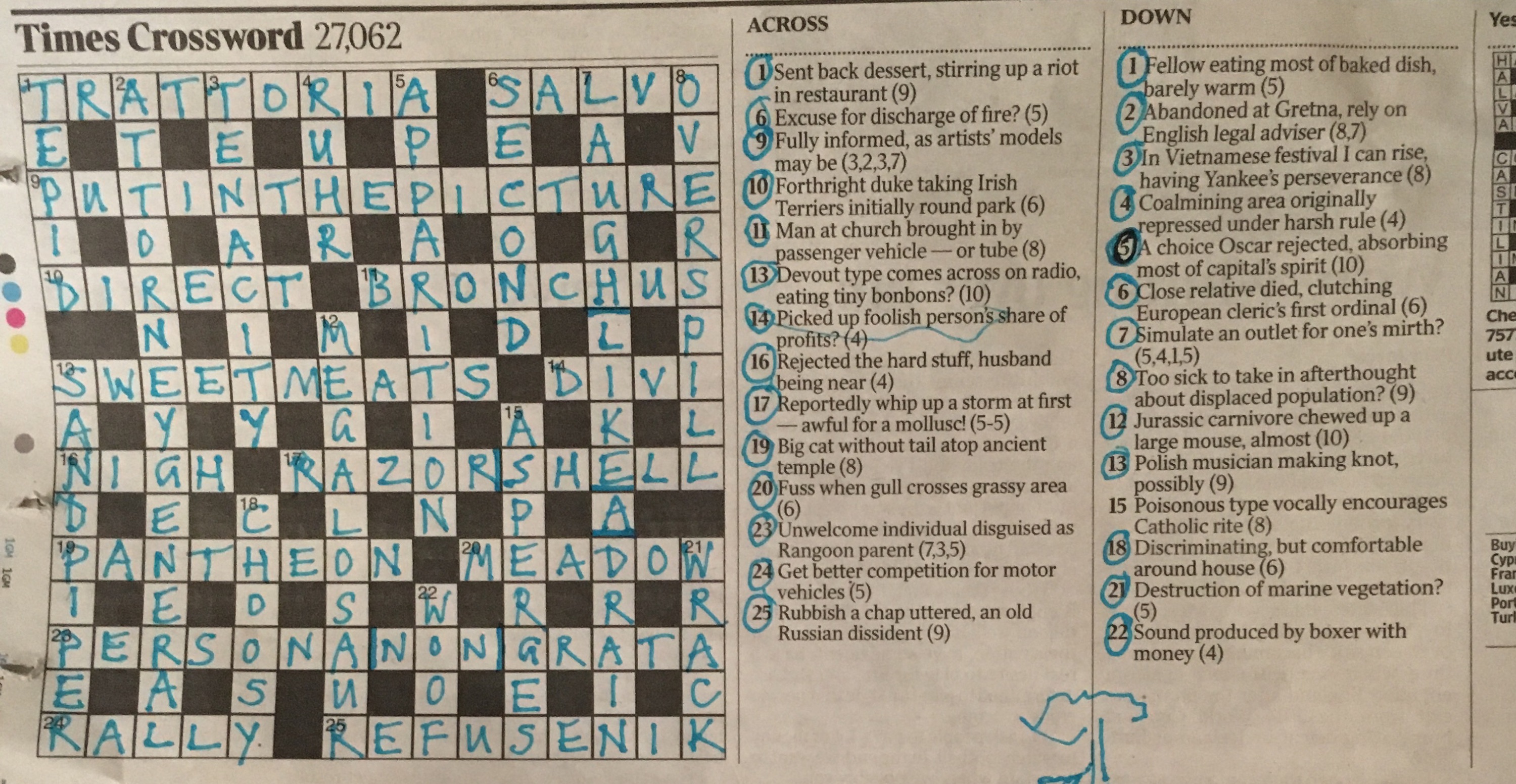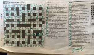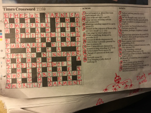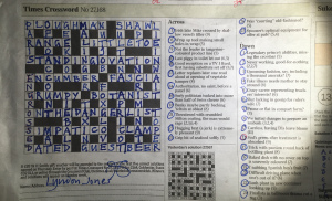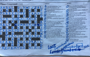 which, incidentally, I still don’t fully understand. 12 across is also obscure, but was at least guessable (I now get it!). It’s always a little peeving when there is one clue left, but I wouldn’t have got it without combing through the dictionary.