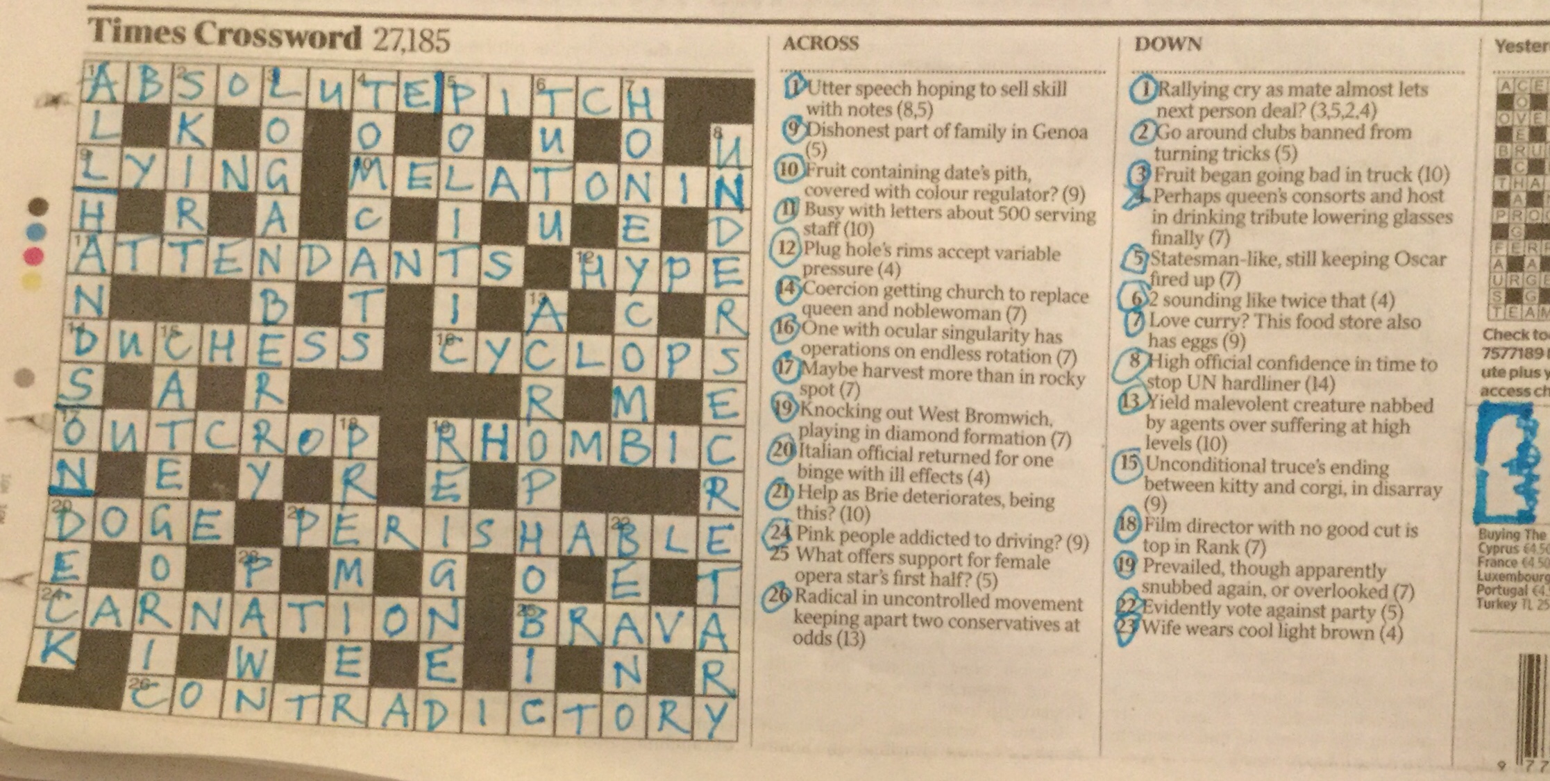 I solved everything but the two missing letters required to form “statice”, a genus of sea-lavender and a pretty “maritime plant”, so I wouldn’t have won this week, not that it ever seems possible!